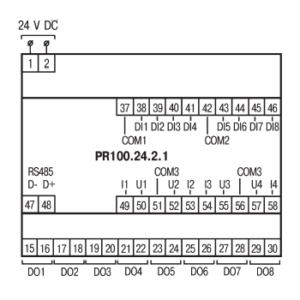 | PR100.24.2.1 | 24 V DC, 8DI + 8DO + 4AI, 1x RS485 (Modbus RTU/ASCII) |